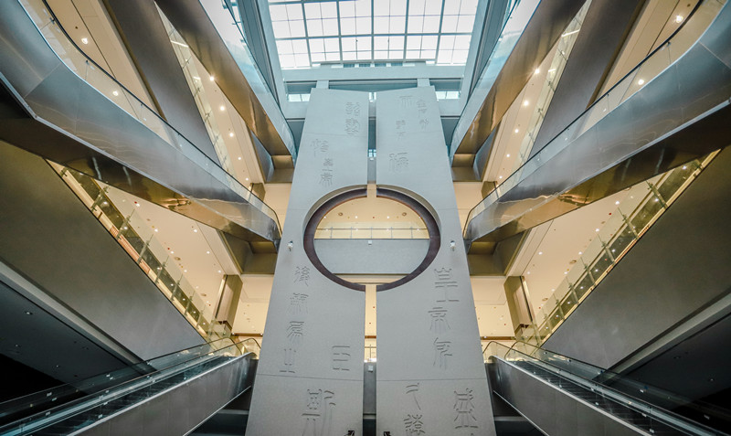 從空中俯覽,博物館、圖書館、科技館三個文化場館呈品字布局,之間有數(shù)條連廊貫通,既相互獨立,又渾然一體。博物館外立面設(shè)計端莊大氣,極具歷史人文氣息;圖書館一處紅色外立面采用剪紙藝術(shù)設(shè)計而成,十分搶眼;科技館運用線條和凹凸變化,將科幻元素巧妙融入建筑之中。