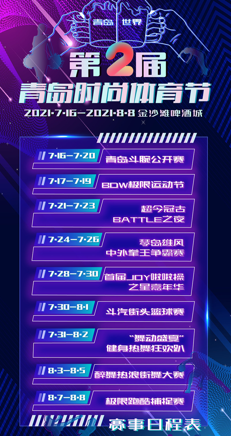 7月16日-8月8日,第31屆青島國際啤酒節(jié)將在青島西海岸新區(qū)金沙灘啤酒城舉行。屆時(shí),第二屆“時(shí)尚體育節(jié)”將在金沙灘啤酒城舉辦,包含斗腕、極限運(yùn)動(dòng)、拳王爭霸賽、搏克、街頭籃球、街舞、跑酷等9大類賽事30余項(xiàng)體育活動(dòng)。與去年相比,本屆體育節(jié)賽事規(guī)格升級、活動(dòng)多樣、參賽范圍更廣,體育競賽表演更豐富,將為市民游客奉上一場集競技性、觀賞性、參與性于一體的體育盛會(huì)。